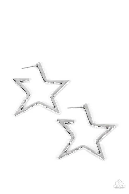 A hammered silver bar delicately folds into a star-shaped hoop, resulting in a stellar metallic shimmer. Earring attaches to a standard post fitting.