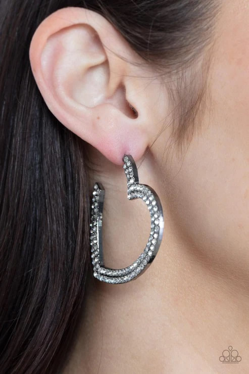 Tow rows of blinding white rhinestones are encrusted along the front of a heart shaped gunmetal hoop, creating a heart-stopping sparkle. Hoop measures approximately 2" in diameter. Earring attaches to a standard post fitting.