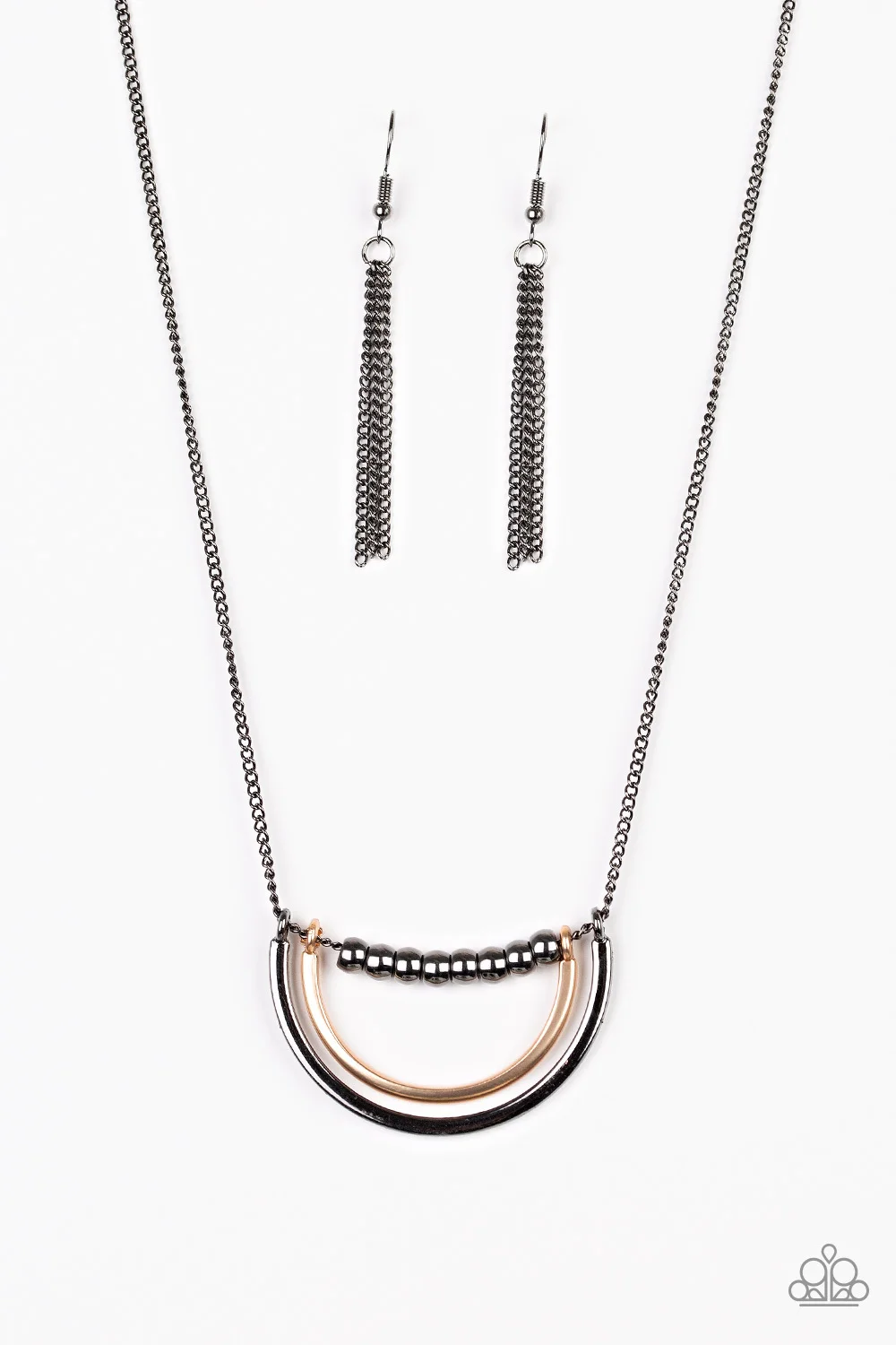 A strand of shiny gunmetal beads give way to bowing gold and gunmetal frames, creating an edgy pendant below the collar. Features an adjustable clasp closure.