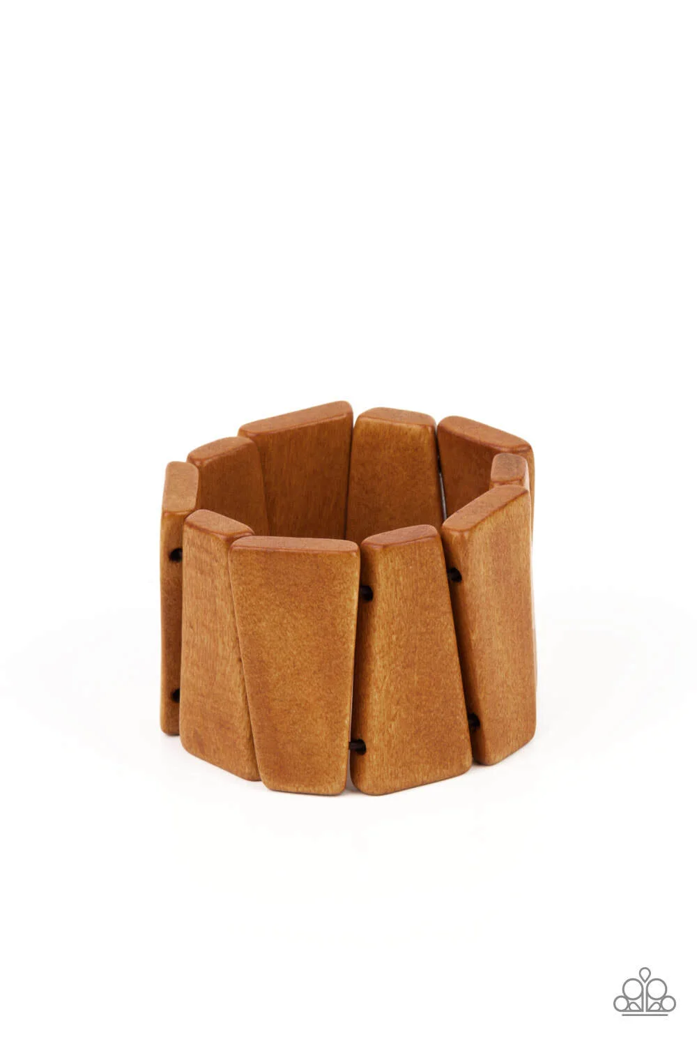 Polished in a natural brown finish, chunky triangular wooden frames are threaded along stretchy bands around the wrist for an earthy look.