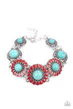 Featuring refreshing turquoise stone centers, studded silver frames double-link with red petaled floral frames around the wrist for a colorfully seasonal look. Features an adjustable clasp closure.