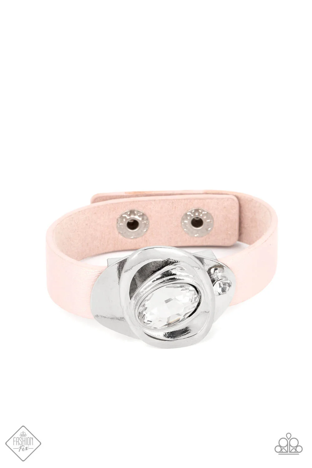 Attached to shimmery strands of pink leather, a pair of oversized and warped silver links delicately overlaps into a contemporary centerpiece below the collar. An exaggerated white gem asymmetrically embellishes the silvery accent piece, adding unexpected elegance to the modern design. Features an adjustable clasp closure.