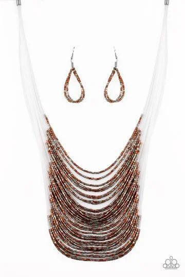 Strand after strand of metallic copper and gunmetal seed beads fall together to create a bold statement piece. Features an adjustable clasp closure.