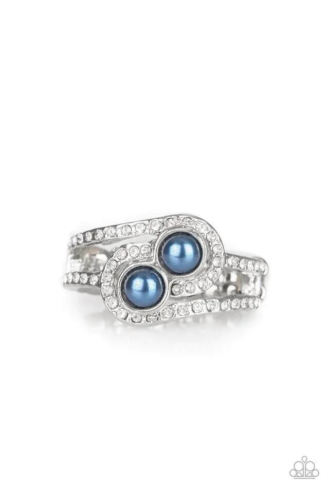 Glittery white rhinestone encrusted bands swirl around a pair of dainty blue pearls for a refined look. Features a dainty stretchy band for a flexible fit.
