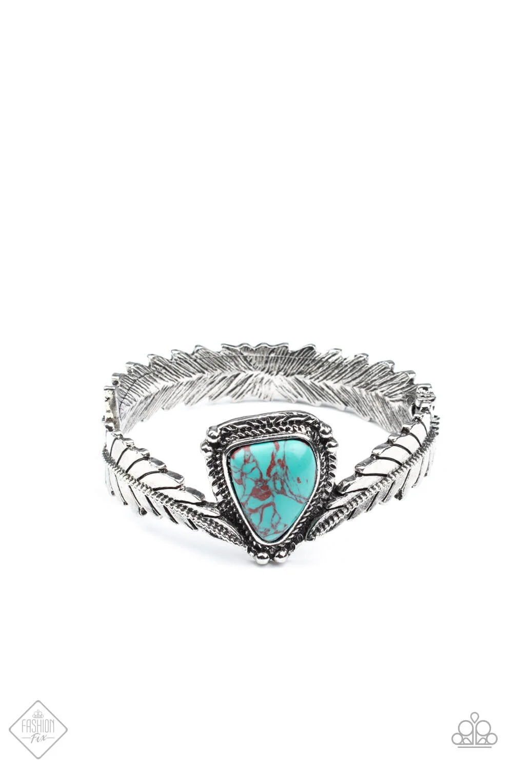 A twisted metal bar lines the center of an elongated silver feather as it curves into a rustic cuff. Featuring a studded and textured silver frame, an asymmetrical turquoise stone is balanced between the ends of the silver feather, creating an earthy centerpiece. Features a hinged closure.