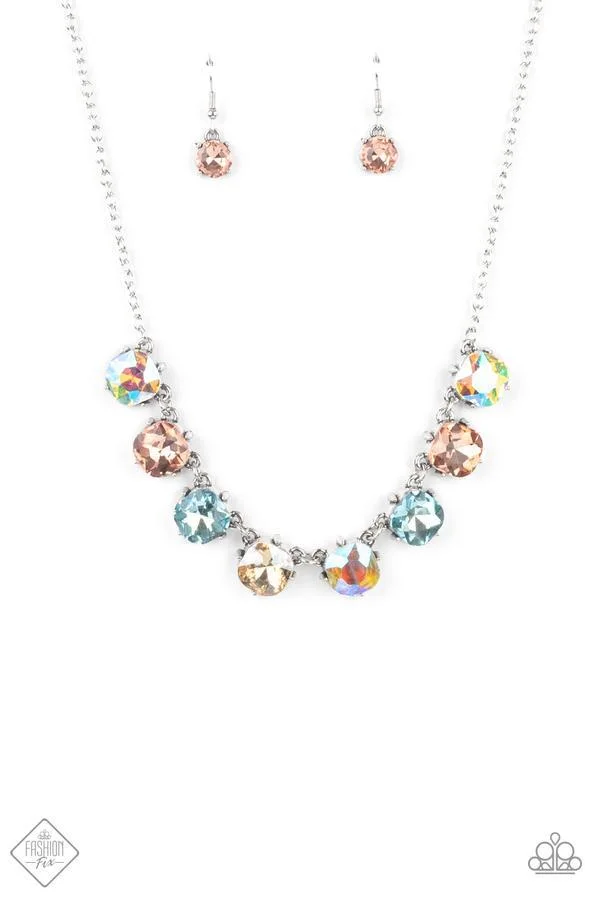 A pretty pastel palette of multicolored rhinestones, set in classic silver pronged fittings, creates sparkle and shine as they dance below the collar. Features an adjustable clasp closure.