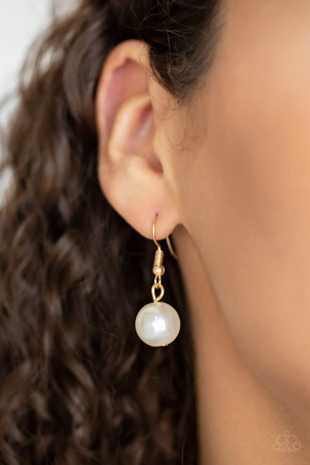 Two strands of dramatic white pearls flank one strand of oversized gold chain, creating statement-making layers below the collar. Features an adjustable clasp closure.