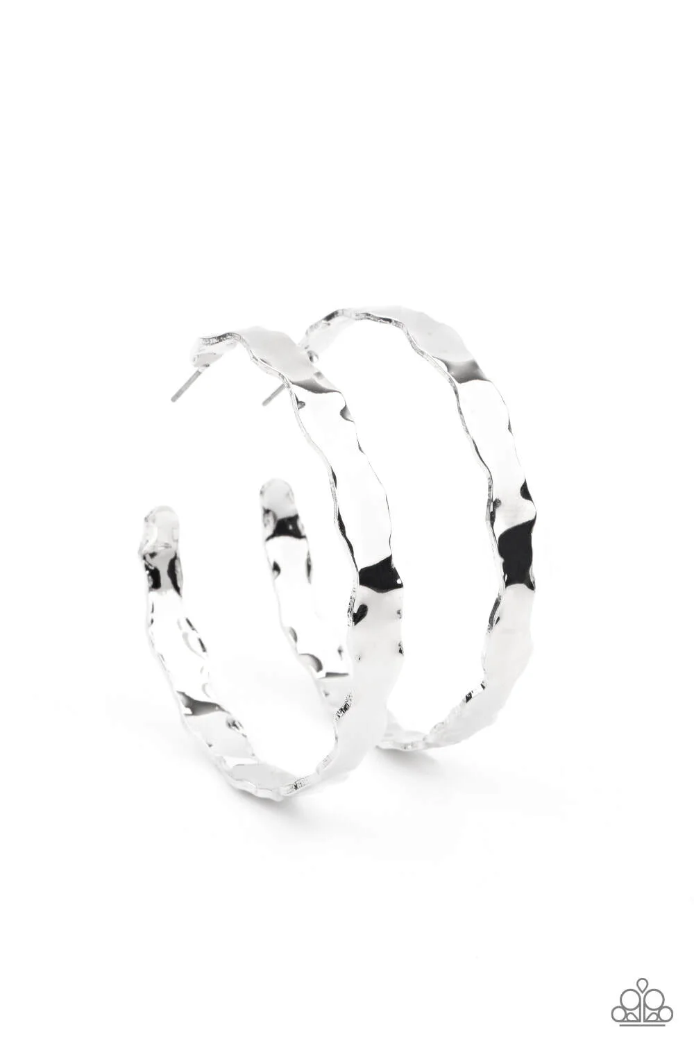 Featuring raw, scalloped edges, a hammered silver hoop curls around the ear for an electrifying look. Earring attaches to a standard post fitting. Hoop measures approximately 2 1/4" in diameter.