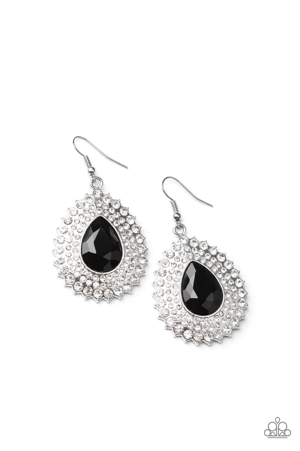 A black teardrop gem is pressed into the center of a teardrop silver frame radiating with ripples of glassy white rhinestones, creating a dynamic dazzle. Earring attaches to a standard fishhook fitting.