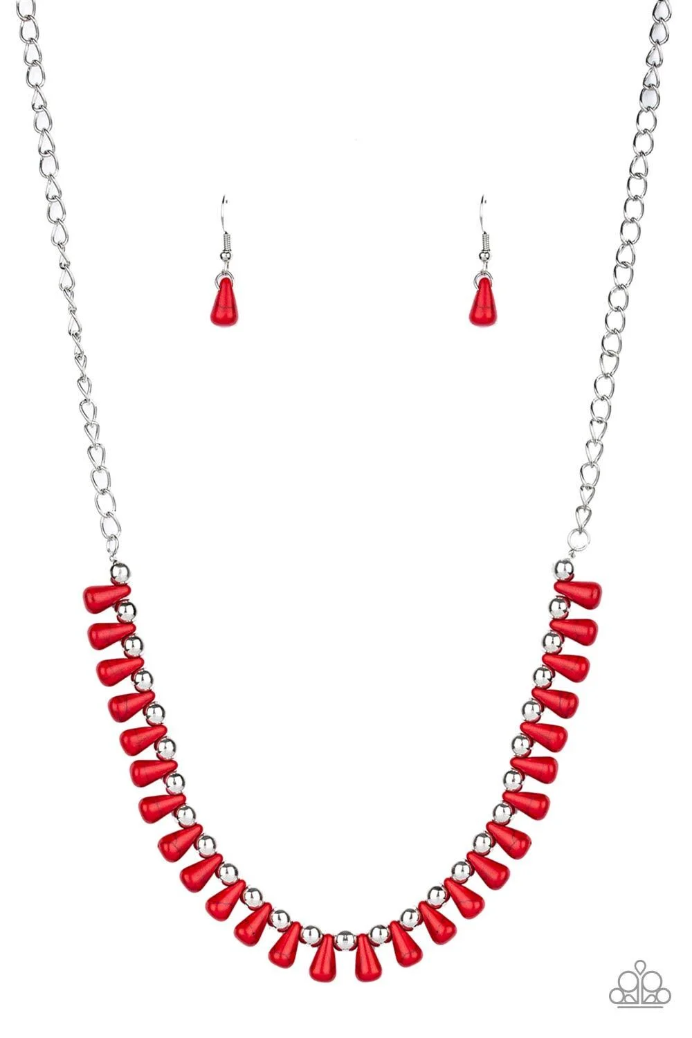 Red teardrop stones and classic silver beads are threaded along an invisible wire. The earthy beads alternate below the collar, creating a wild fringe. Features an adjustable clasp closure.