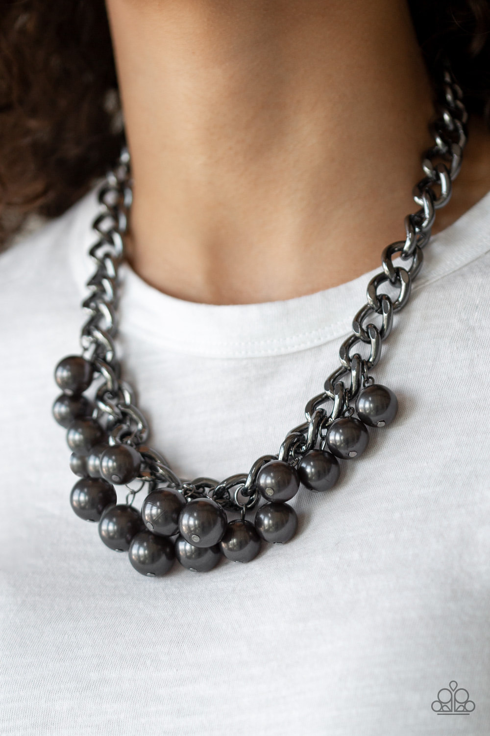 Pearly gunmetal beads swing from the bottom of a hefty gunmetal chain, creating a dramatic fringe below the collar. Features an adjustable clasp closure.