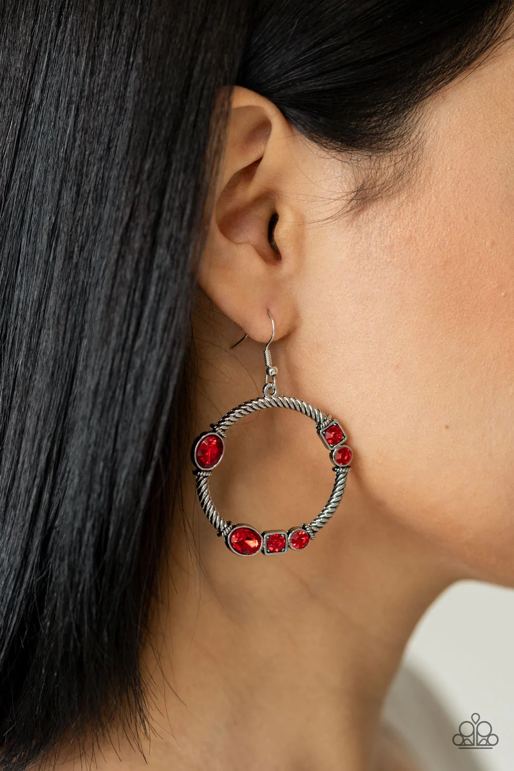 Featuring round, oval, and square cuts, a collection of fiery red rhinestones haphazardly adorn the front of a textured silver hoop, for a gritty-glamorous look. Earring attaches to standard fishhook fittings.