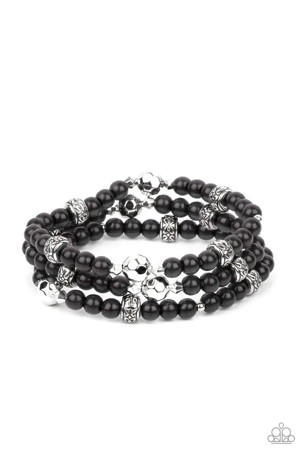 A dainty collection of faceted silver beads, floral embossed accents, and polished black beads are threaded along stretchy bands around the wrist for a colorfully seasonal look.