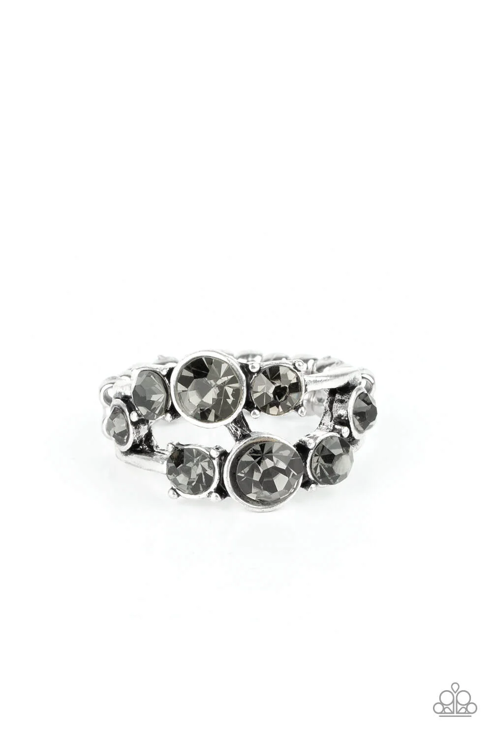 Rows of smoky rhinestones connect across the finger, coalescing into a glamorous band. Features a dainty stretchy band for a flexible fit.