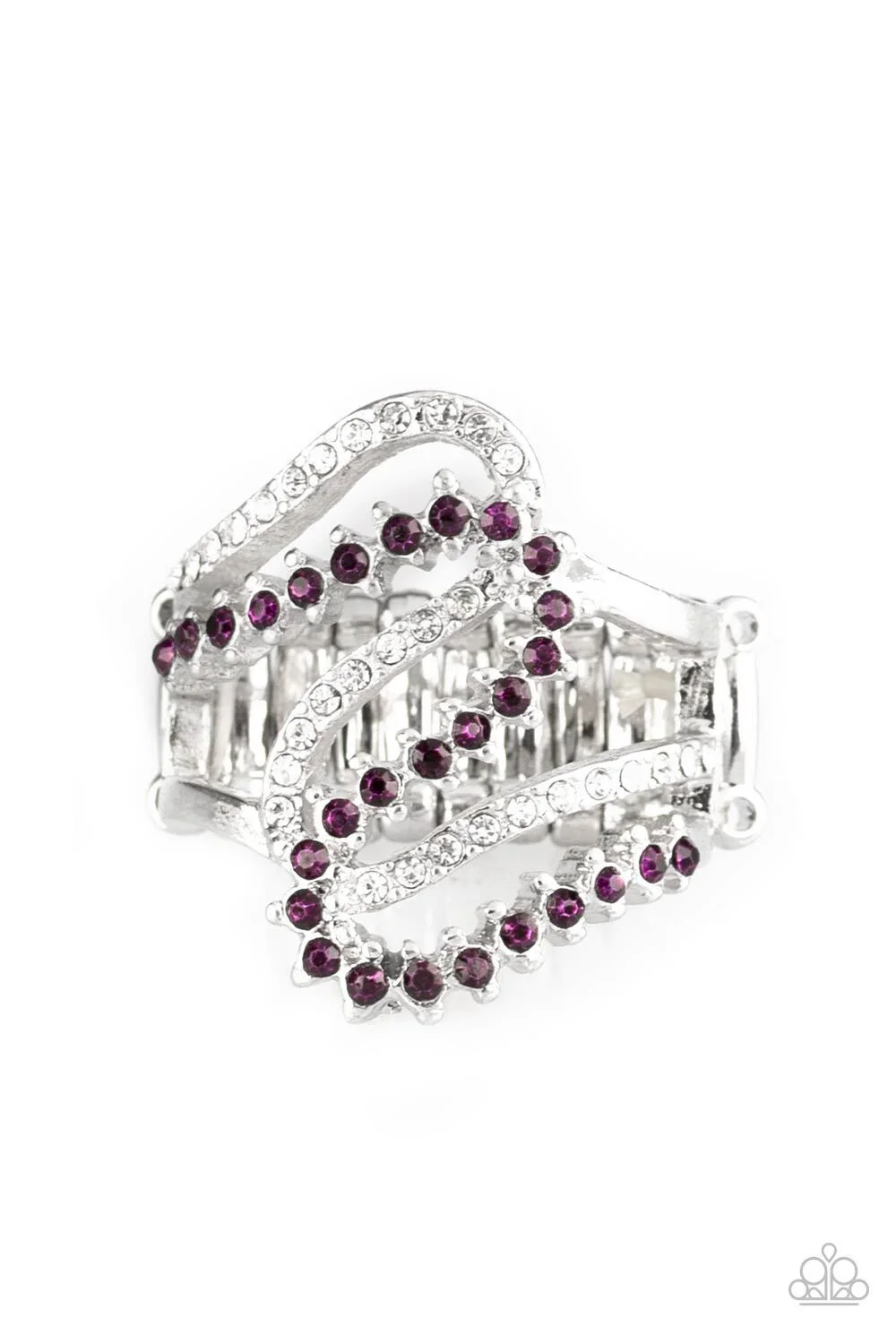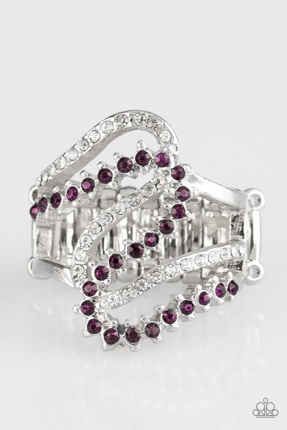 Encrusted in dainty purple and white rhinestones, radiant silver ribbons wave across the finger, coalescing into a whimsical band. Features a stretchy band for a flexible fit.