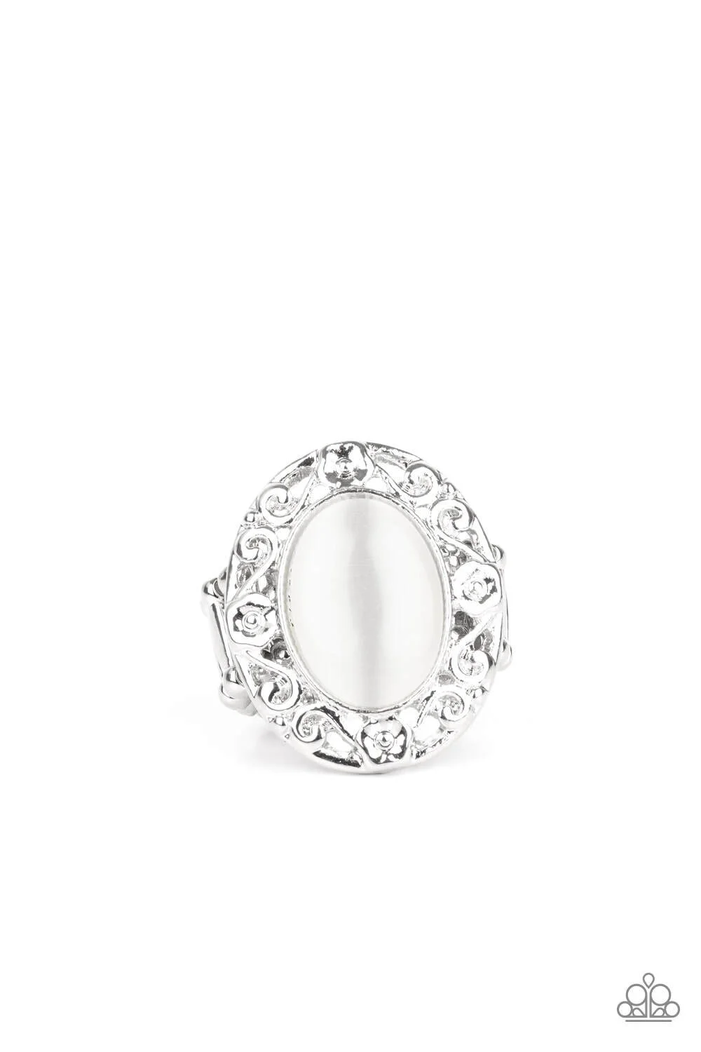 Shimmery floral-like filigree swirls around a glowing white moonstone center, creating a whimsical centerpiece atop the finger. Features a stretchy band for a flexible fit.