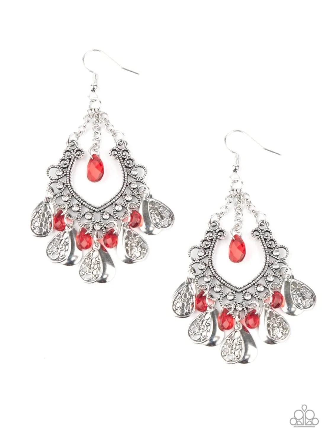 A collection of plain and filigree-filled silver teardrops and pink crystal-like teardrops dangle from the bottom of a frilly silver frame dotted in dainty white rhinestones. A solitaire pink crystal-like bead is suspended from a single chain at the top for a whimsical finish. Earring attaches to a standard fishhook fitting.
