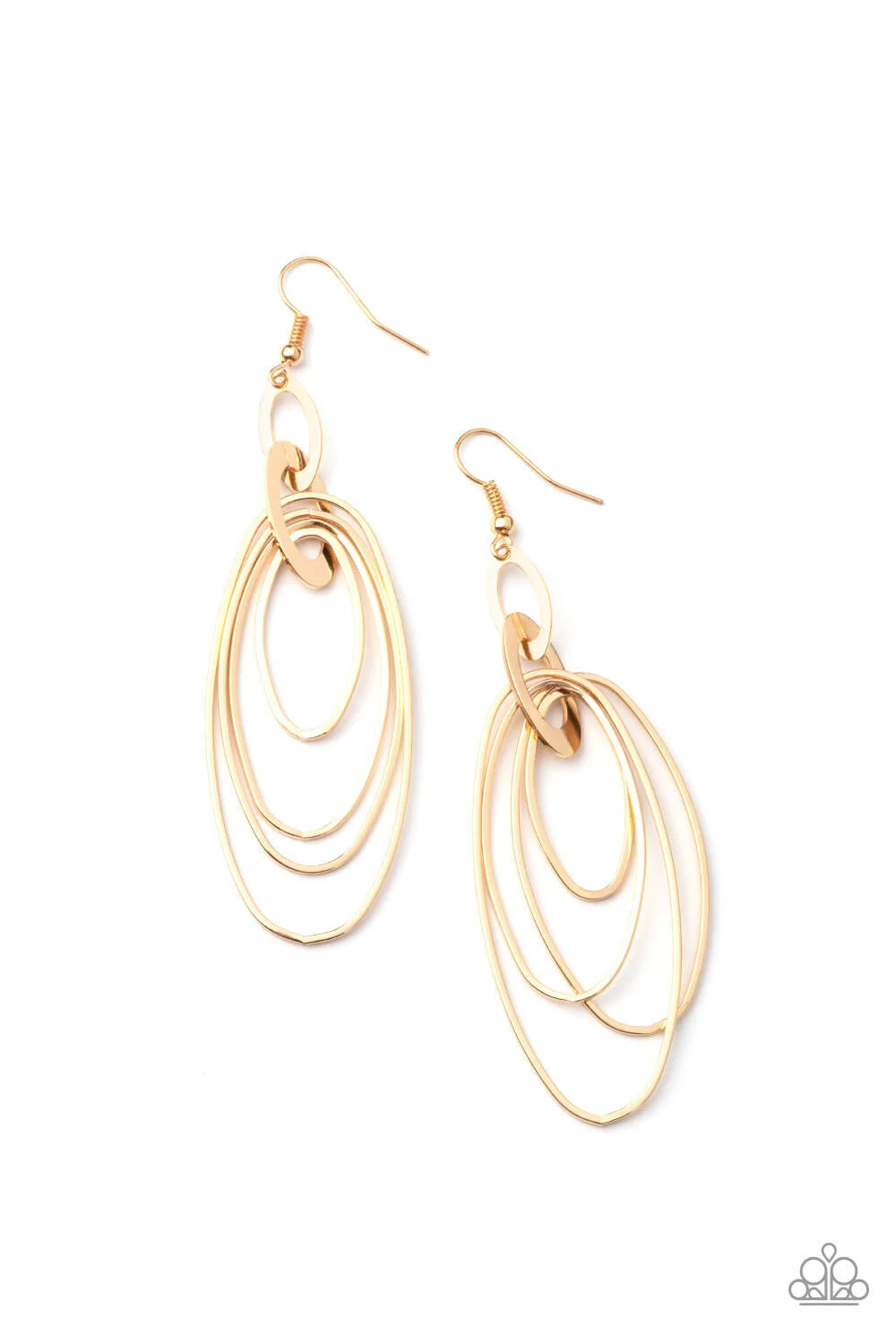 Increasing in size, shiny gold ovals ripple out from the bottom of interconnected flat shiny gold frames, creating a layered lure. Earring attaches to a standard fishhook fitting.