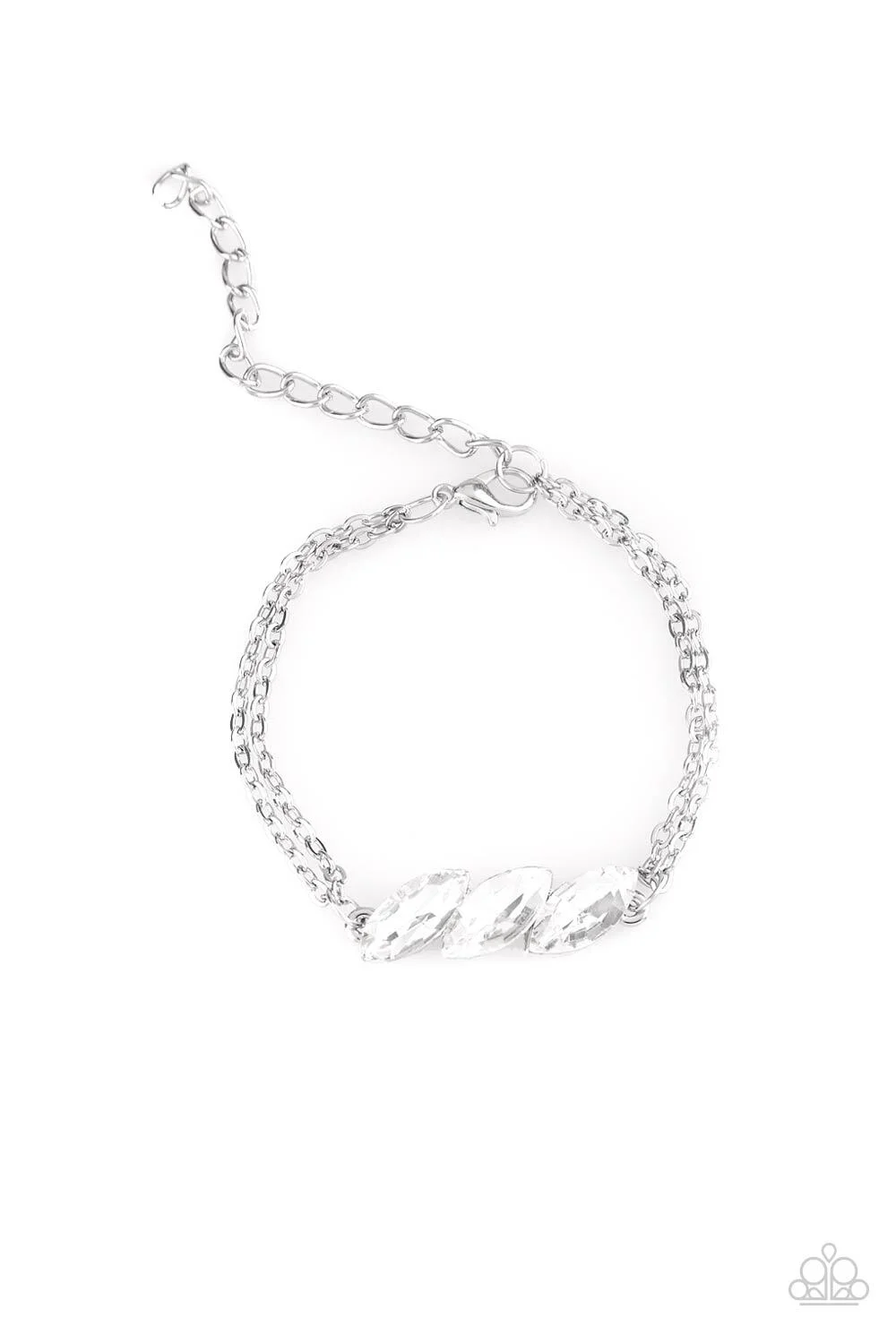 Featuring regal marquise-cuts, a trio of glittery white rhinestones join across the center of the wrist for a timeless look. Features an adjustable clasp closure.