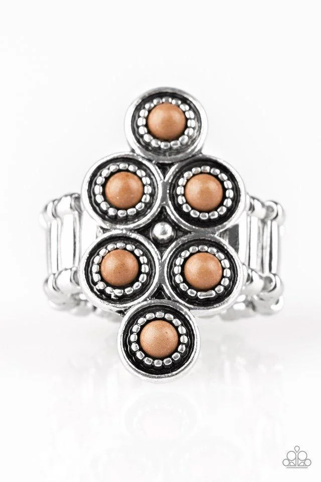 Dainty brown stones are pressed into ornate silver frames, coalescing into an earthy frame atop the finger. Features a stretchy band for a flexible fit.