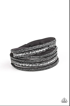Encrusted in rows of glittery black and white rhinestones and flat silver studs, three strands of black suede wrap around the wrist for a sassy look. The elongated band allows for a trendy double wrap around the wrist. Features an adjustable snap closure. All Paparazzi Accessories are lead free and nickel free!