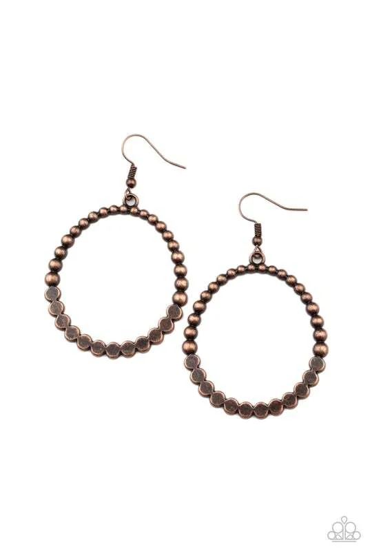 Antiqued copper studs join with flattened copper studs, creating a rustic hoop. Earring attaches to a standard fishhook fitting.