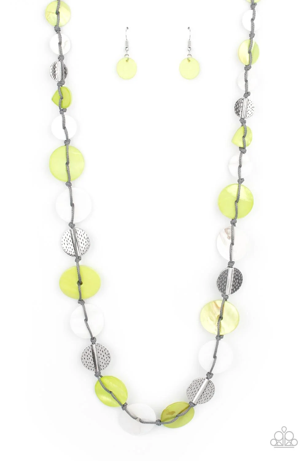 Infused with hammered silver discs, an assortment of green and white shell-like discs are knotted in place along a gray cord, creating a summery display across the chest. Features an adjustable clasp closure.