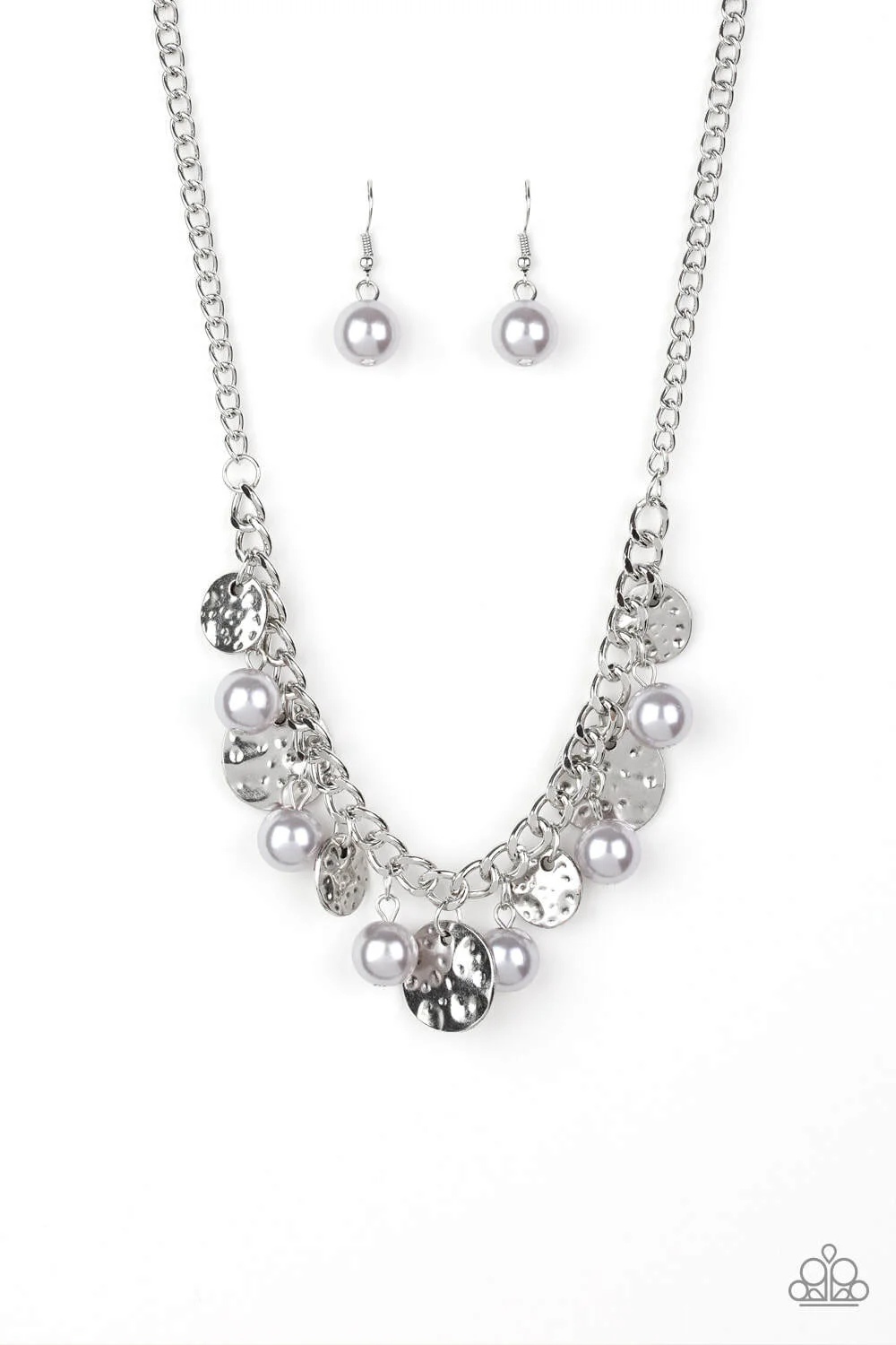 A collection of hammered silver discs and pearly silver beads swing from a thick silver chain, creating an elegant fringe below the collar. Features an adjustable clasp closure.