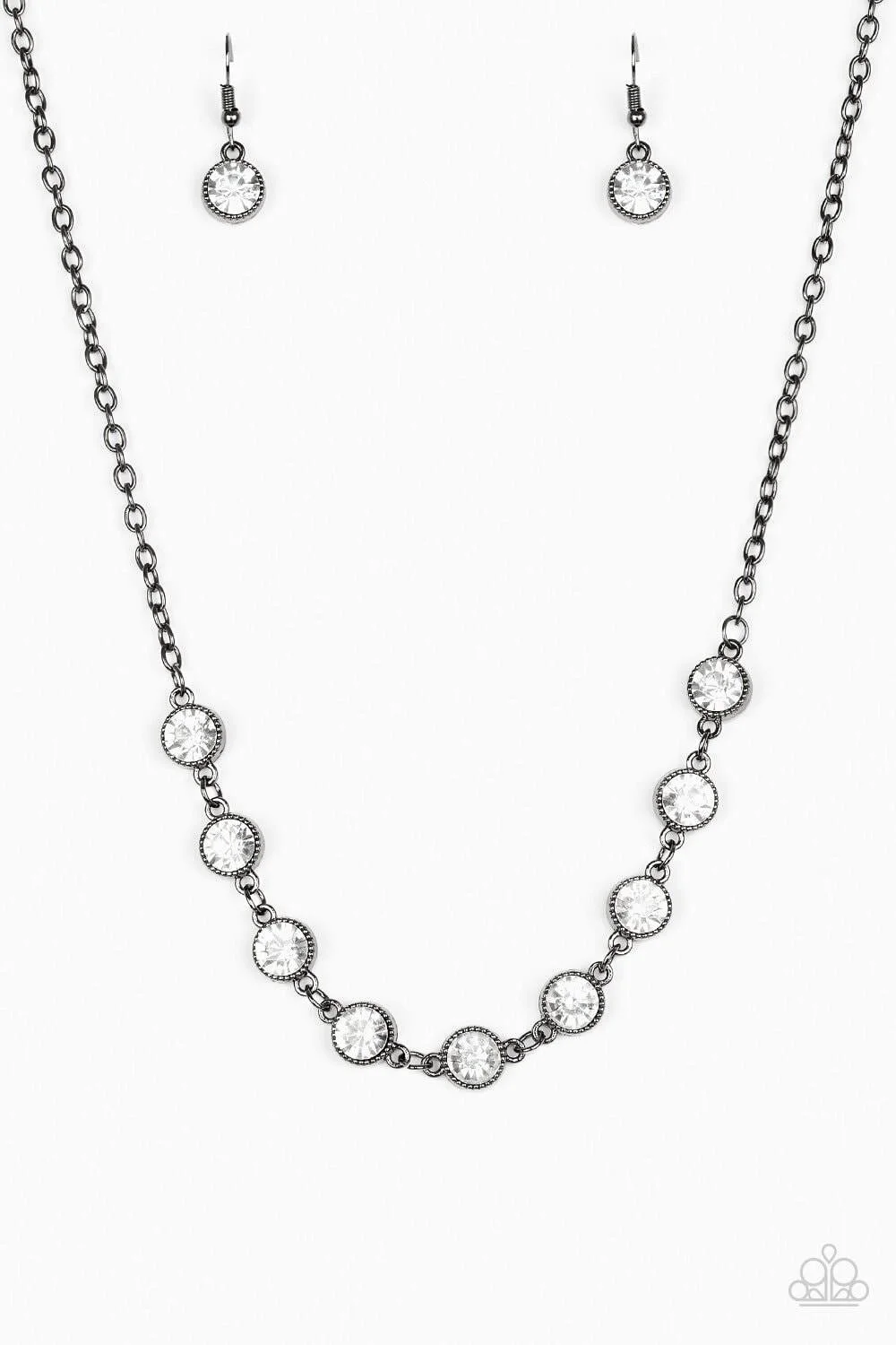 Encased in studded gunmetal frames, glittery white rhinestones link below the collar for a glamorous look. Features an adjustable clasp closure.