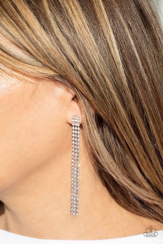 Three strands of glittery white rhinestones free-fall from the ear, coalescing into a timeless chandelier. Earring attaches to a standard post fitting.