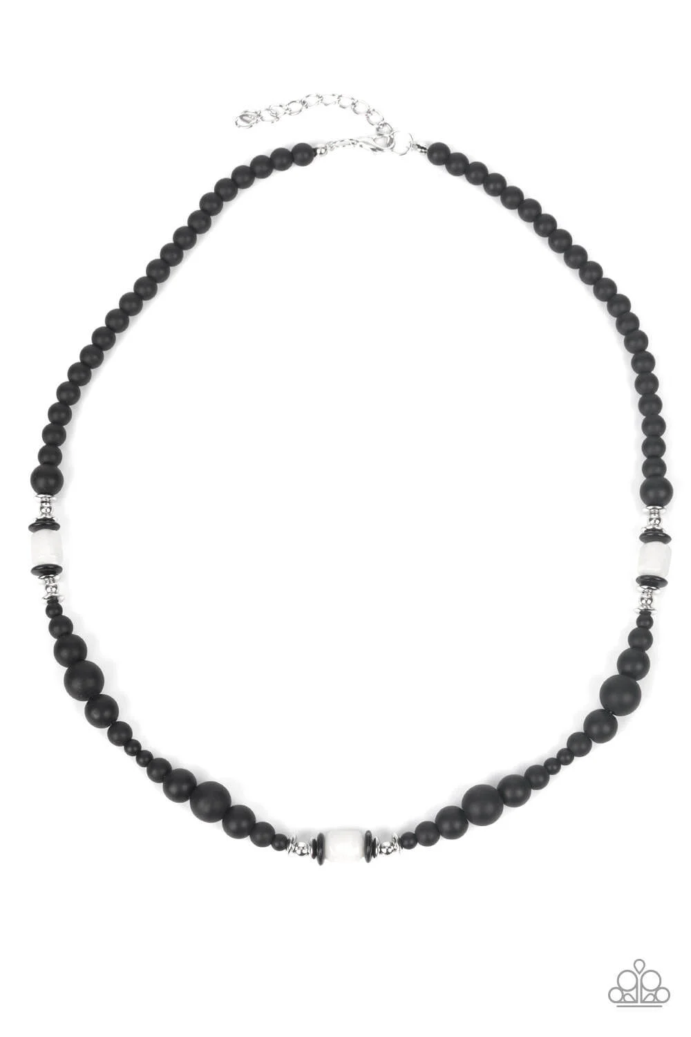 Grounding sections of dainty silver beads and white stone accents adorn a strand of black stone beads, creating an earthy compliment below the collar. Features an adjustable clasp closure.