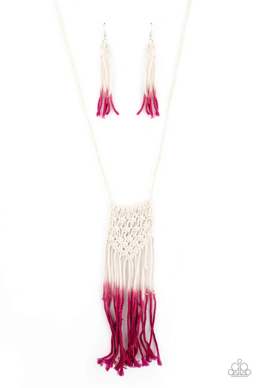 Gradually fading from white to pink, strands of twine-like cording delicately knot and braid into a decorative macramé inspired pendant across the chest. Features an adjustable sliding knot closure.