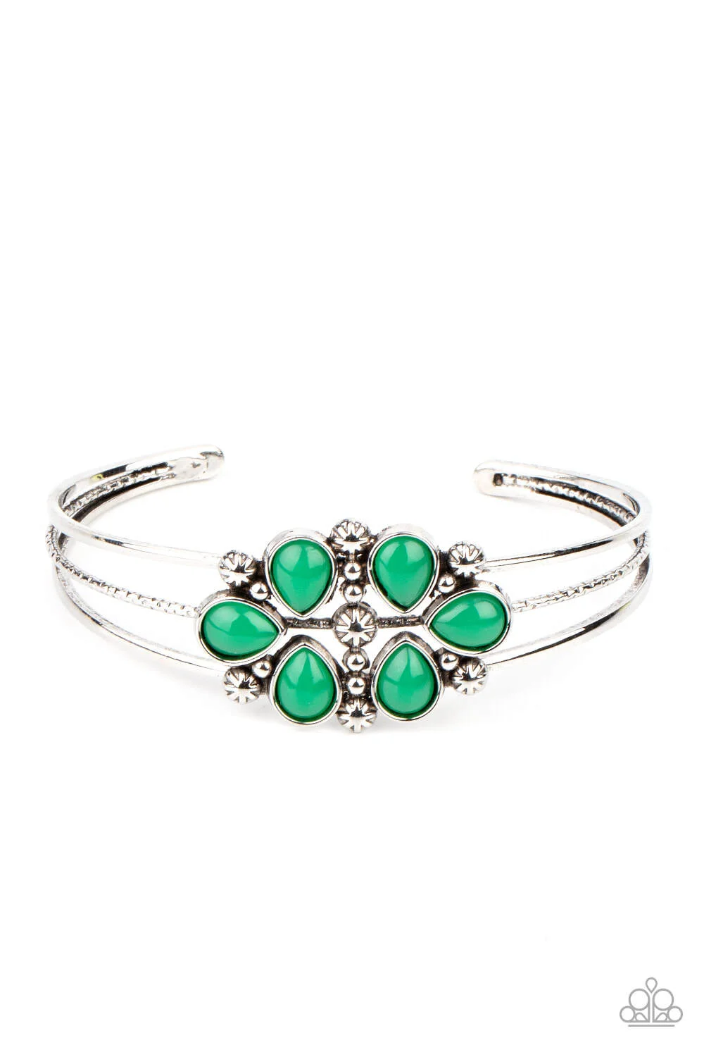 A whimsical collection of glassy Leprechaun teardrop beads, dainty silver studs, and silver floral accents coalesce into a colorful centerpiece atop a layered silver cuff.