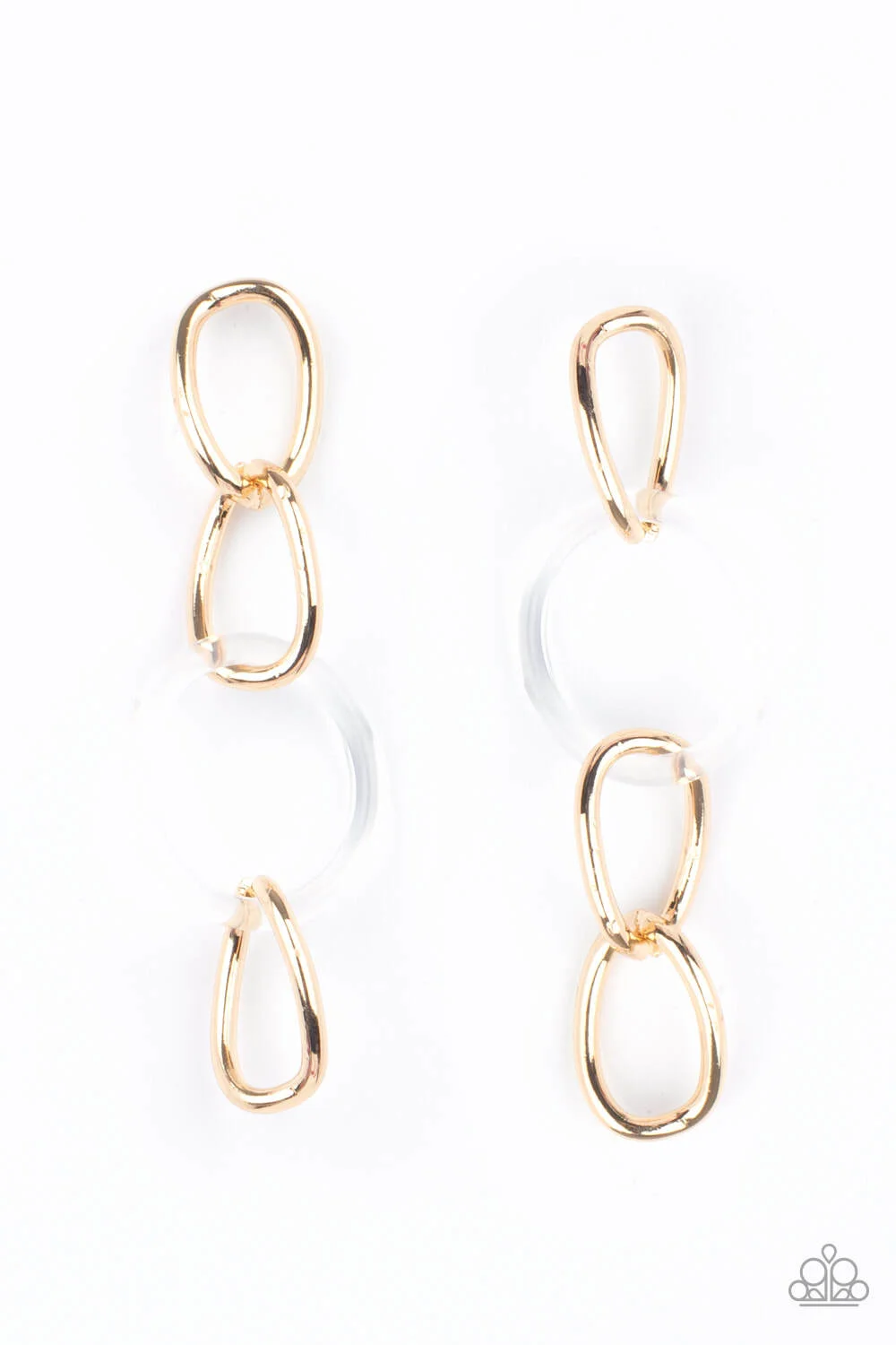 Bright gold oversized links, interrupted by a single large clear acrylic ring, fall from the ear in linked succession for an on-trend fashion statement. Earring attaches to a standard post fitting.