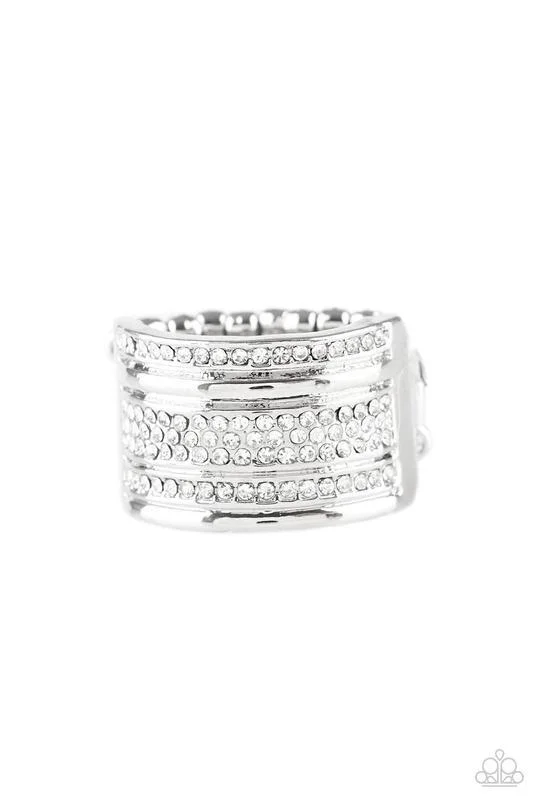 Shimmery silver and white rhinestone encrusted bands stack across the finger for a glamorous look. Features a stretchy band for a flexible fit.