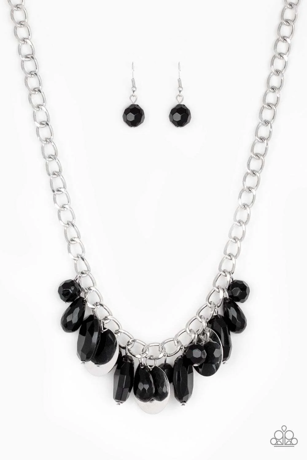 A collection of glassy black beads swings playfully from the bottom of a dramatic silver chain. Glistening silver discs trickle between the colorful beads, creating a refreshing fringe below the collar with shimmering reflections of light. Features an adjustable clasp closure.