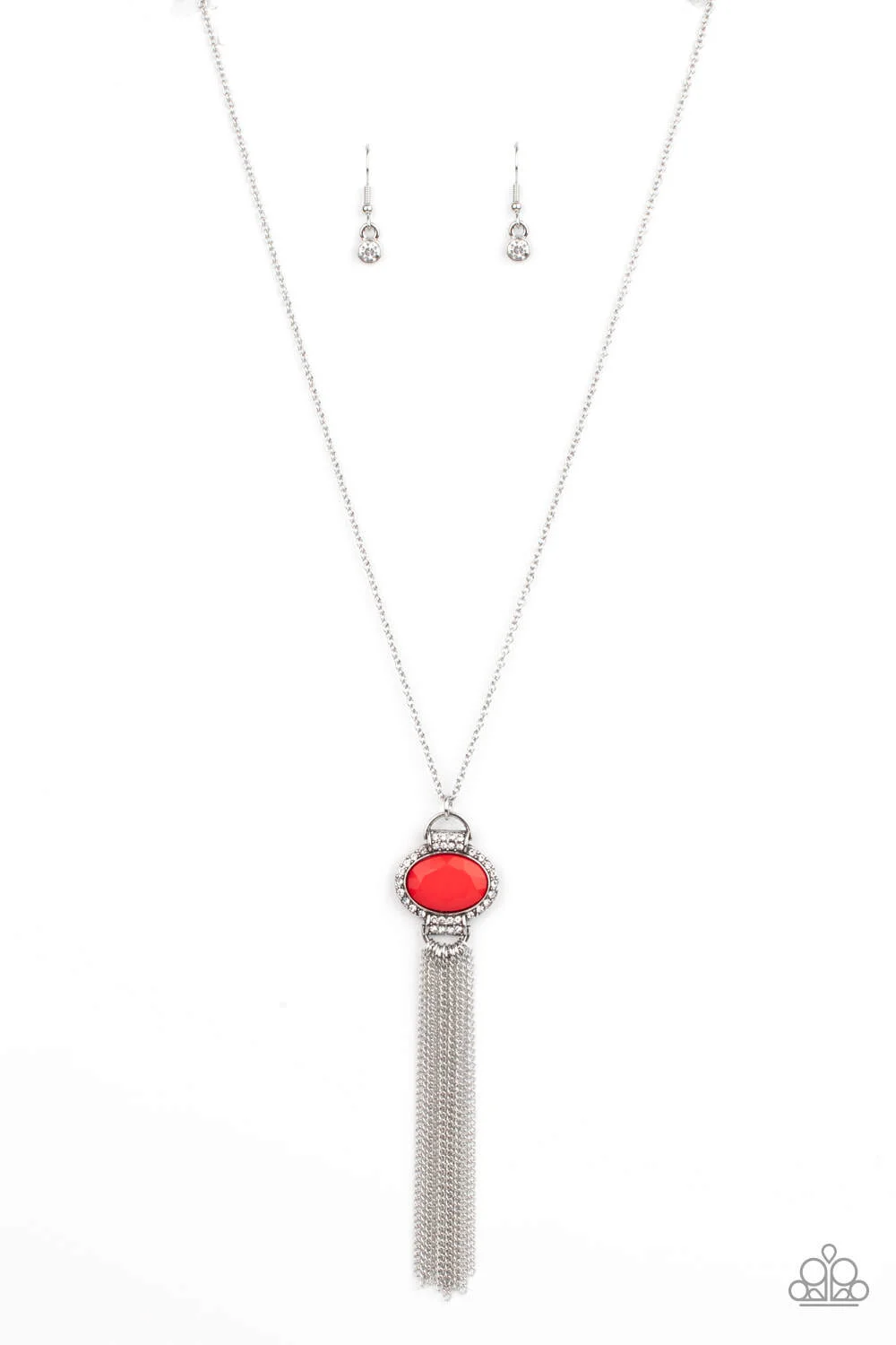Bordered in glassy white rhinestones, a faceted red bead dotted frame gives way to a curtain of shimmery silver chains, creating a glamorous pendant. Features an adjustable clasp closure.