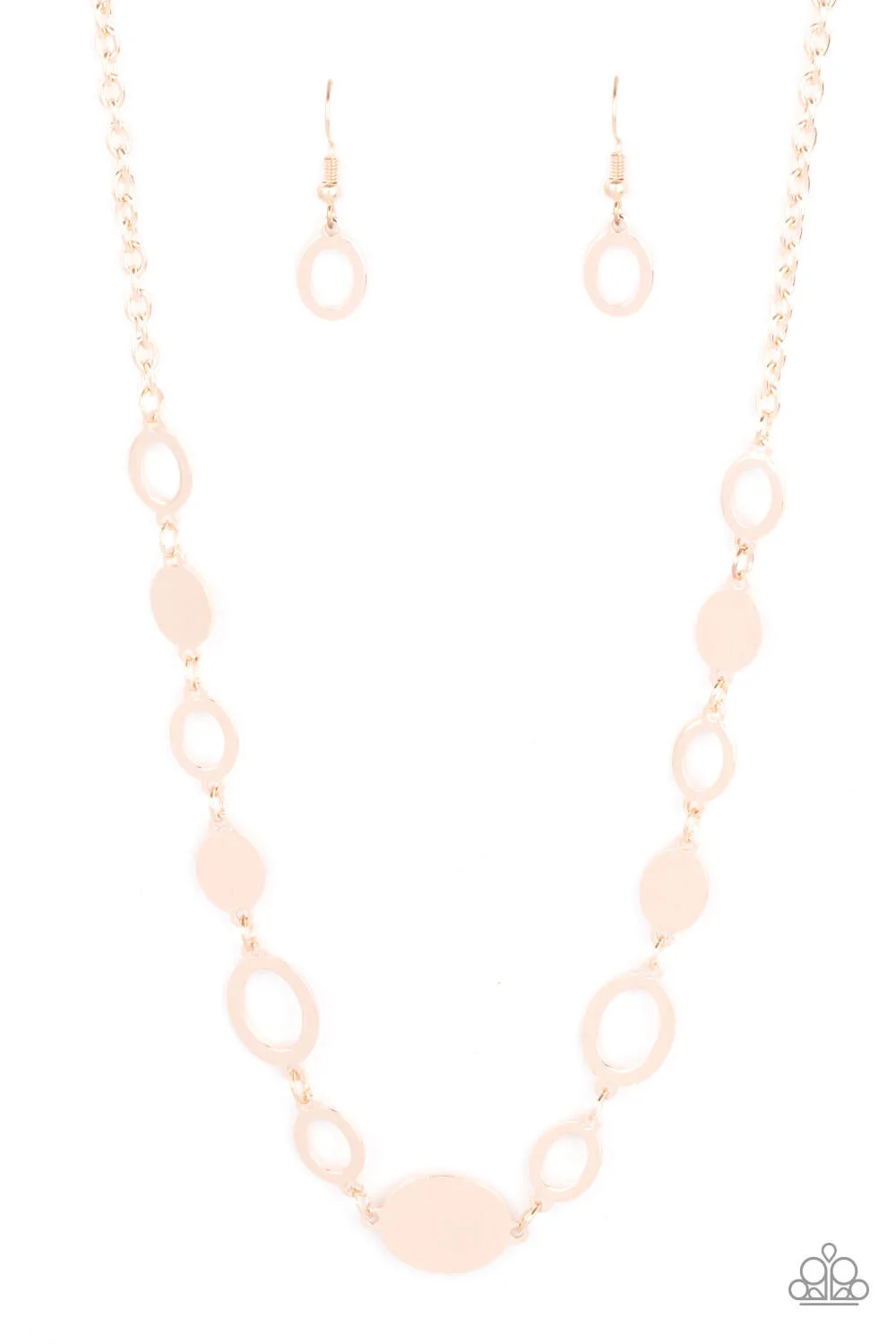 A shiny series of glistening rose gold discs and oval frames delicately link below the collar, creating a casual statement. Features an adjustable clasp closure.