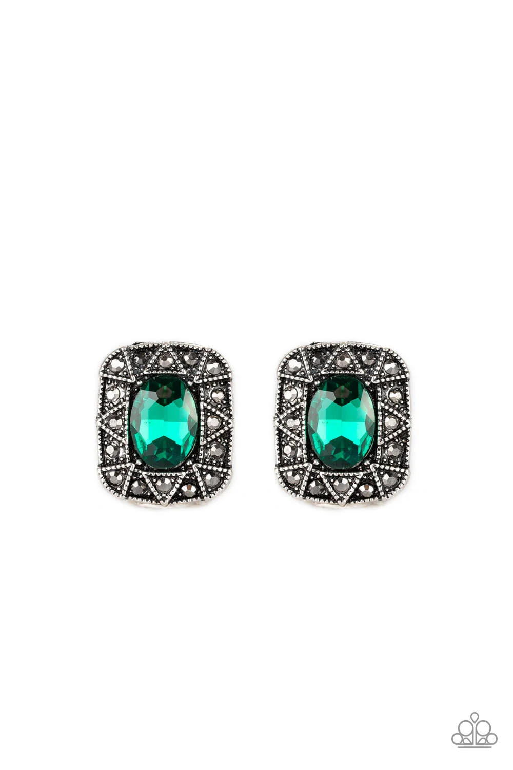 An oval green gem is pressed into a square silver frame radiating with glittery hematite rhinestones and triangular patterns for an edgy refinement. Earring attaches to a standard post fitting.